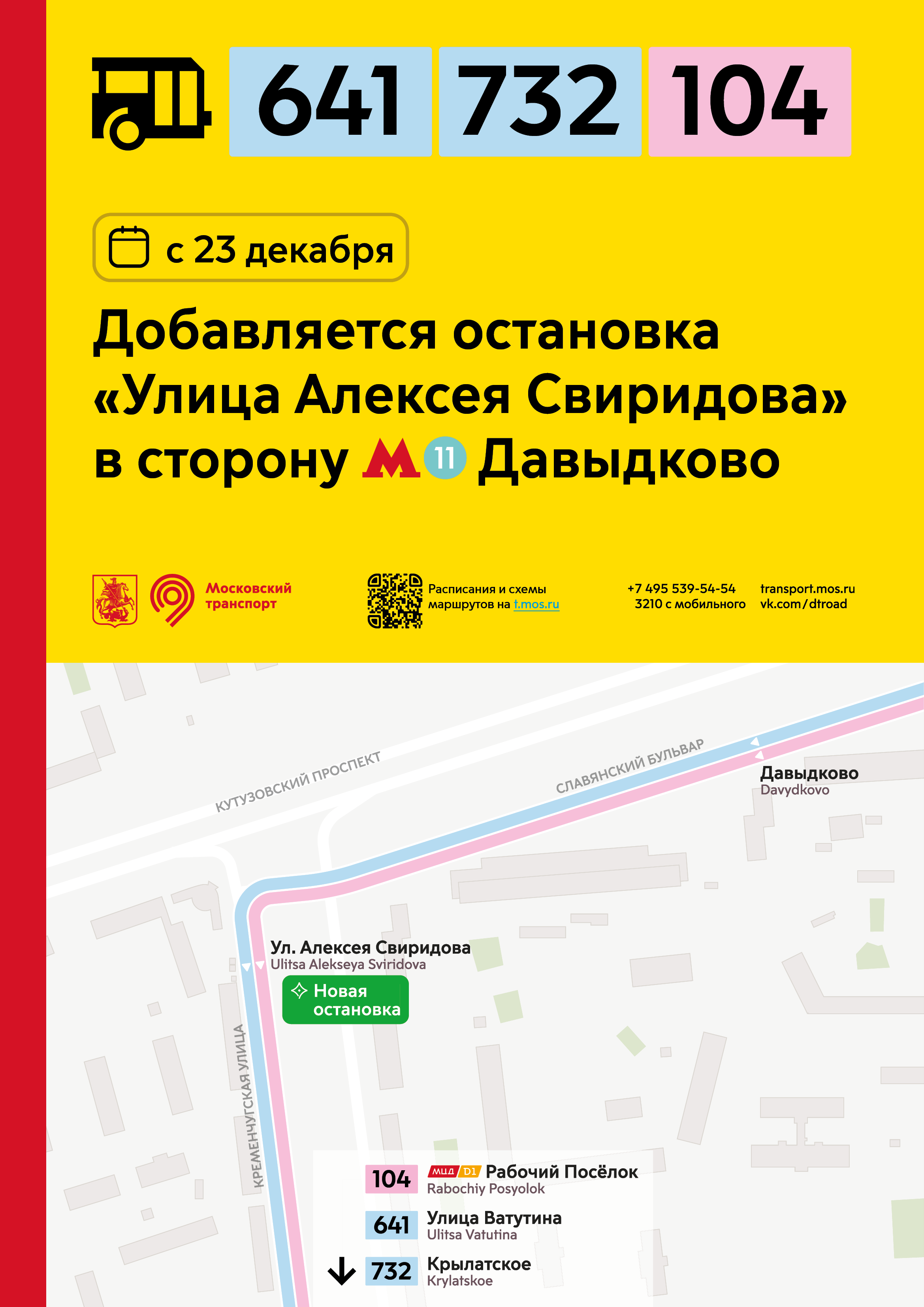 Добавляется остановка «Улица Алексея Свиридова» в сторону метро «Давыдково»