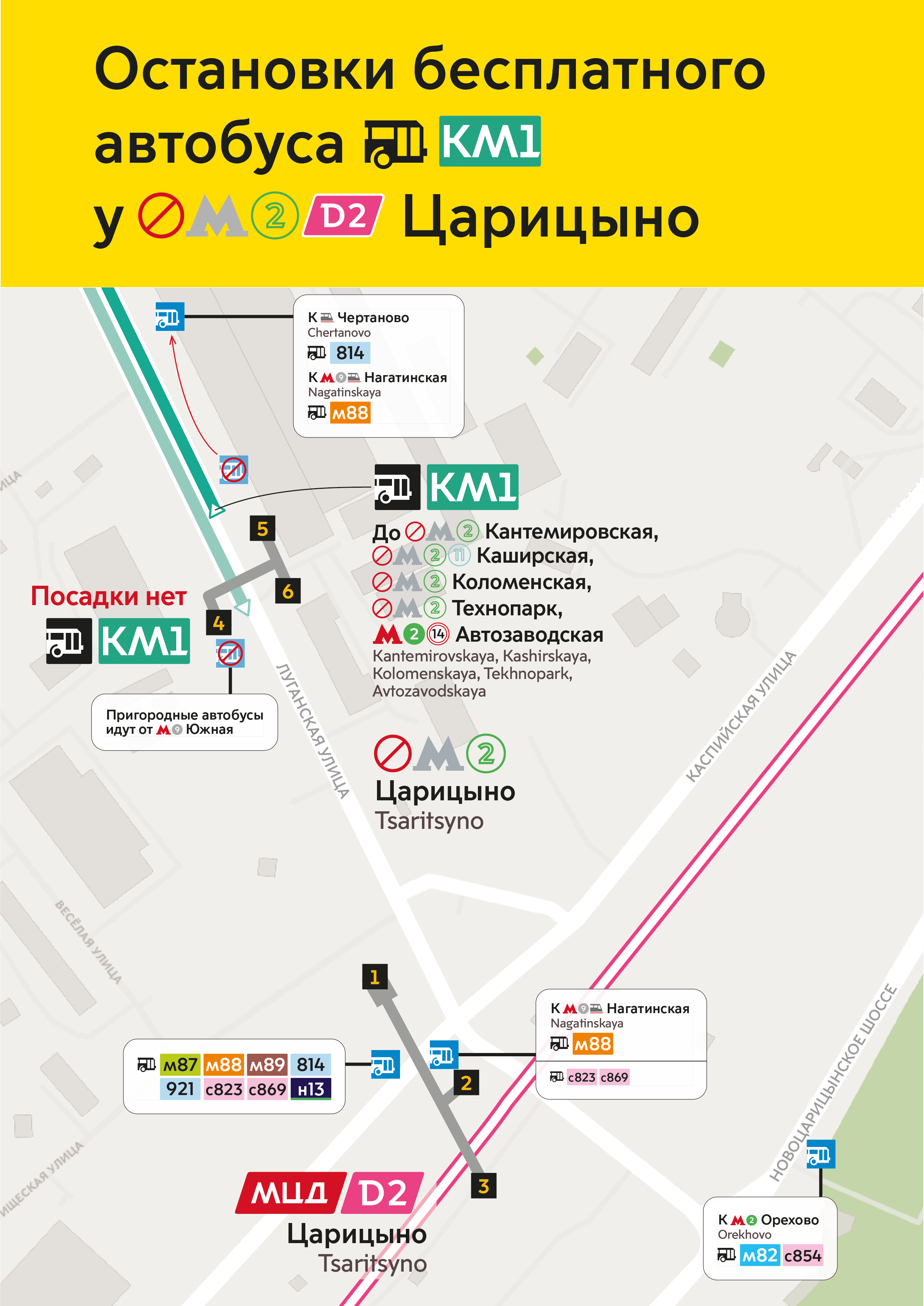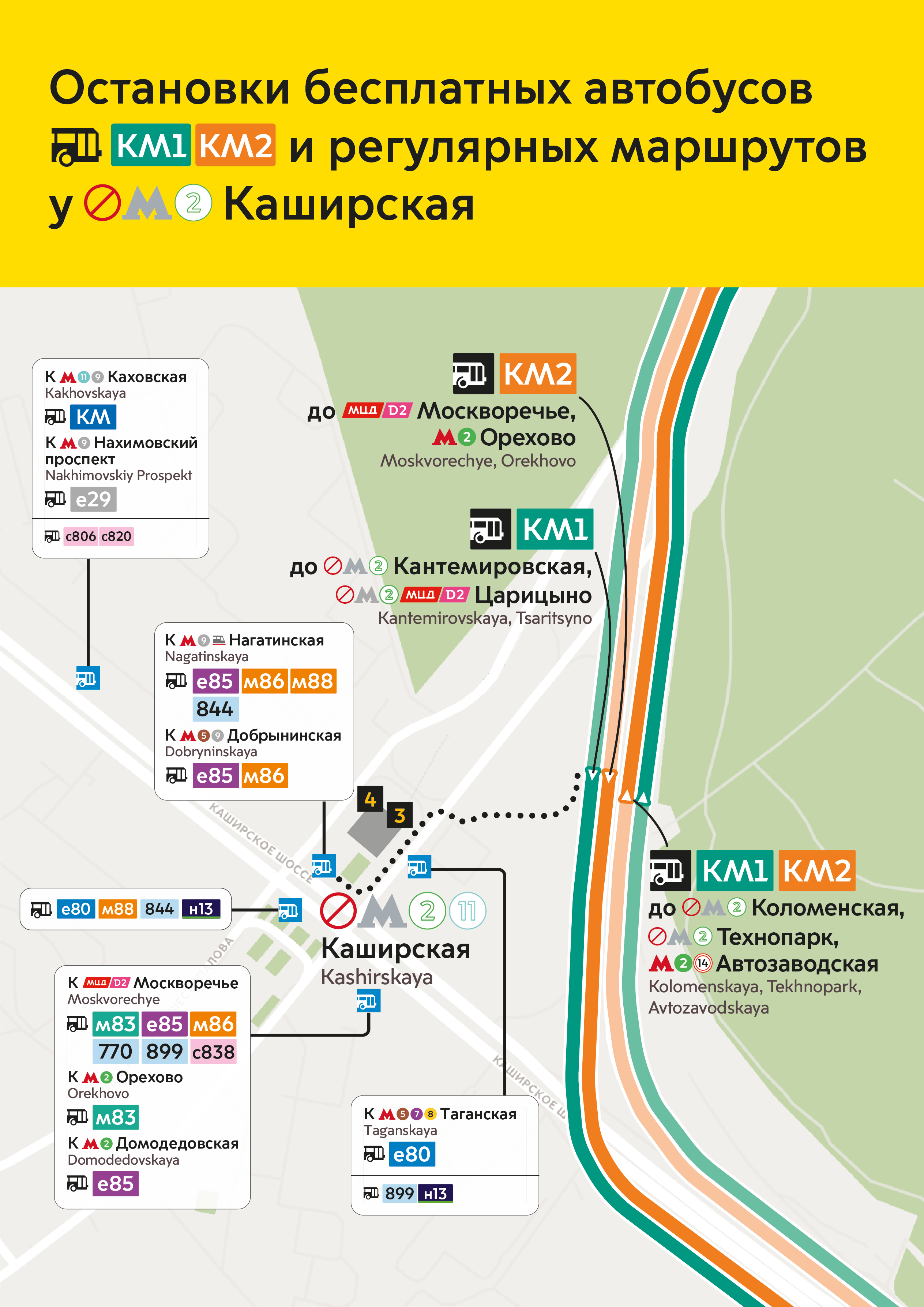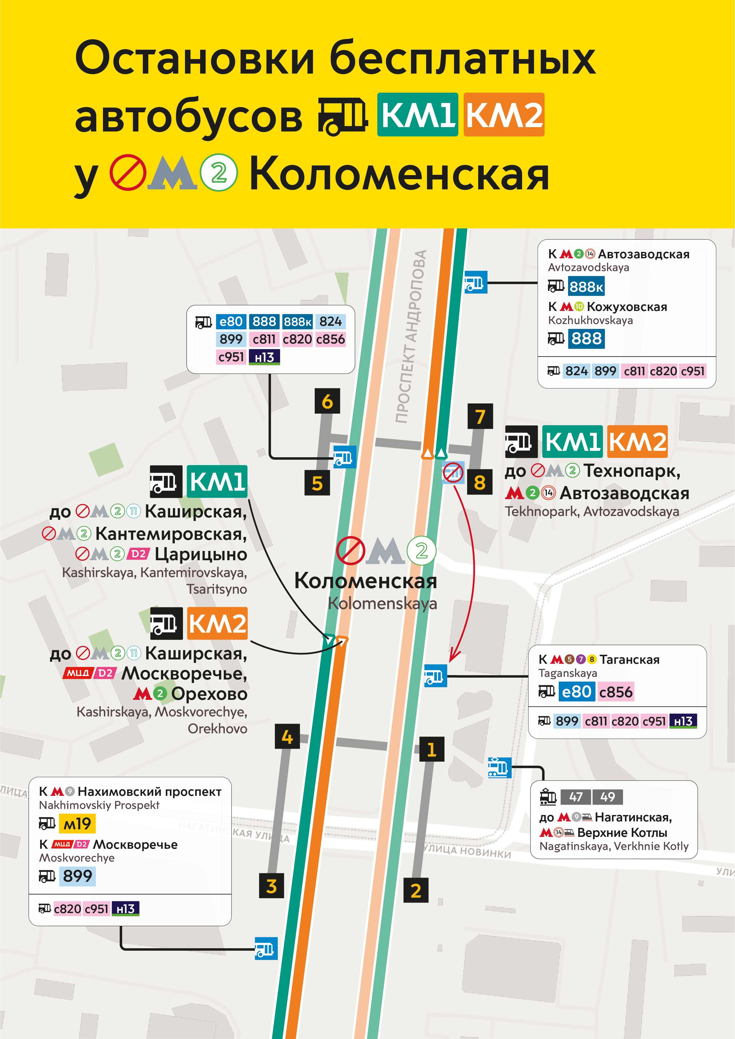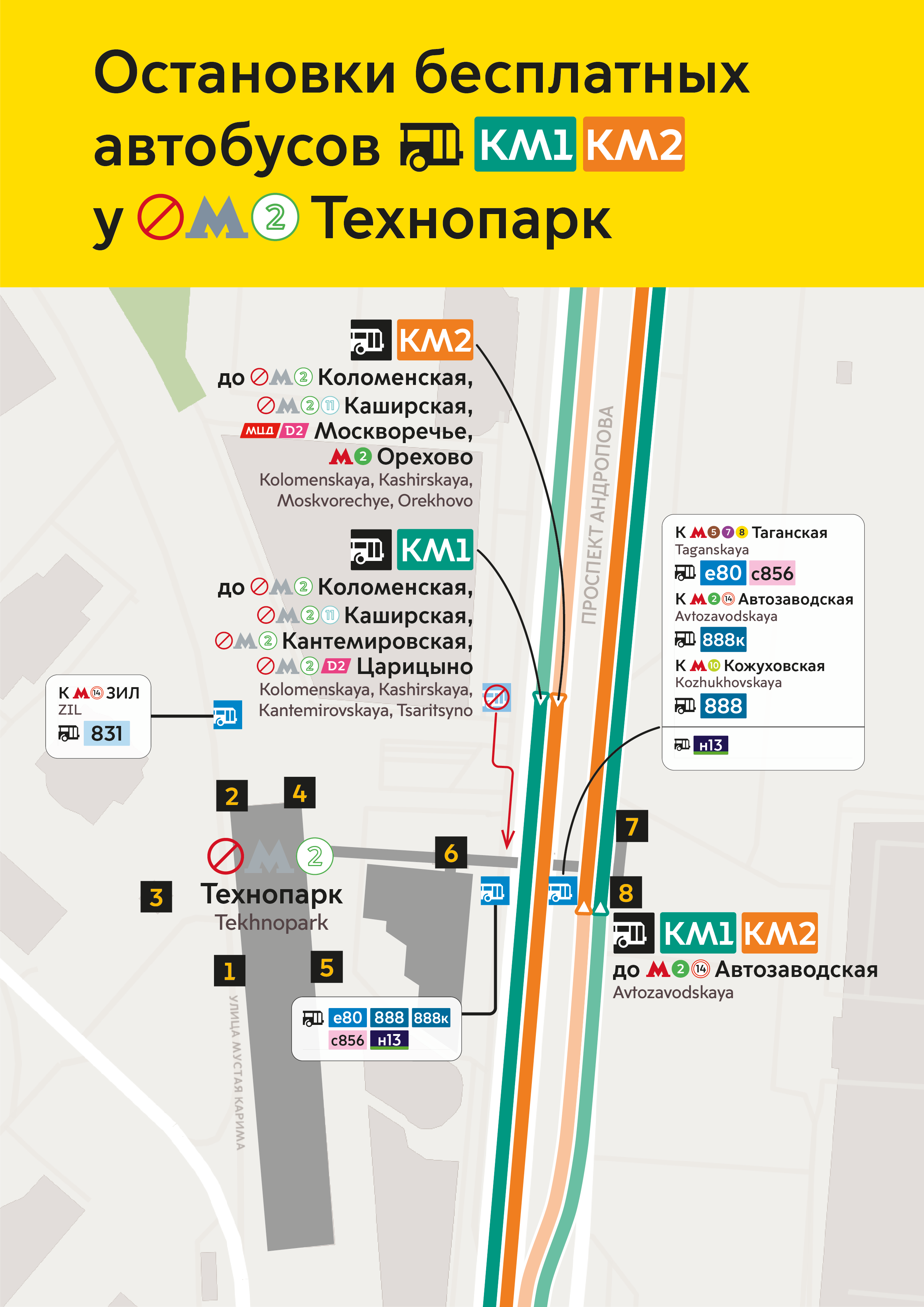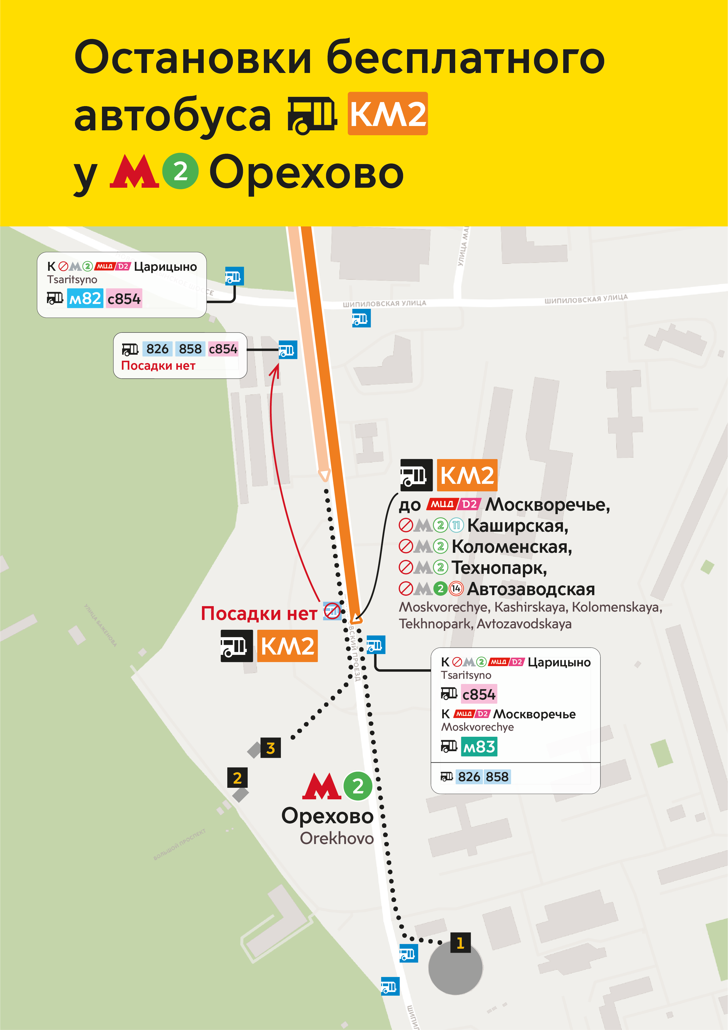 Места остановок автобусов КМ на время закрытия участка Замоскворецкой линии «Автозаводская» — «Орехово»