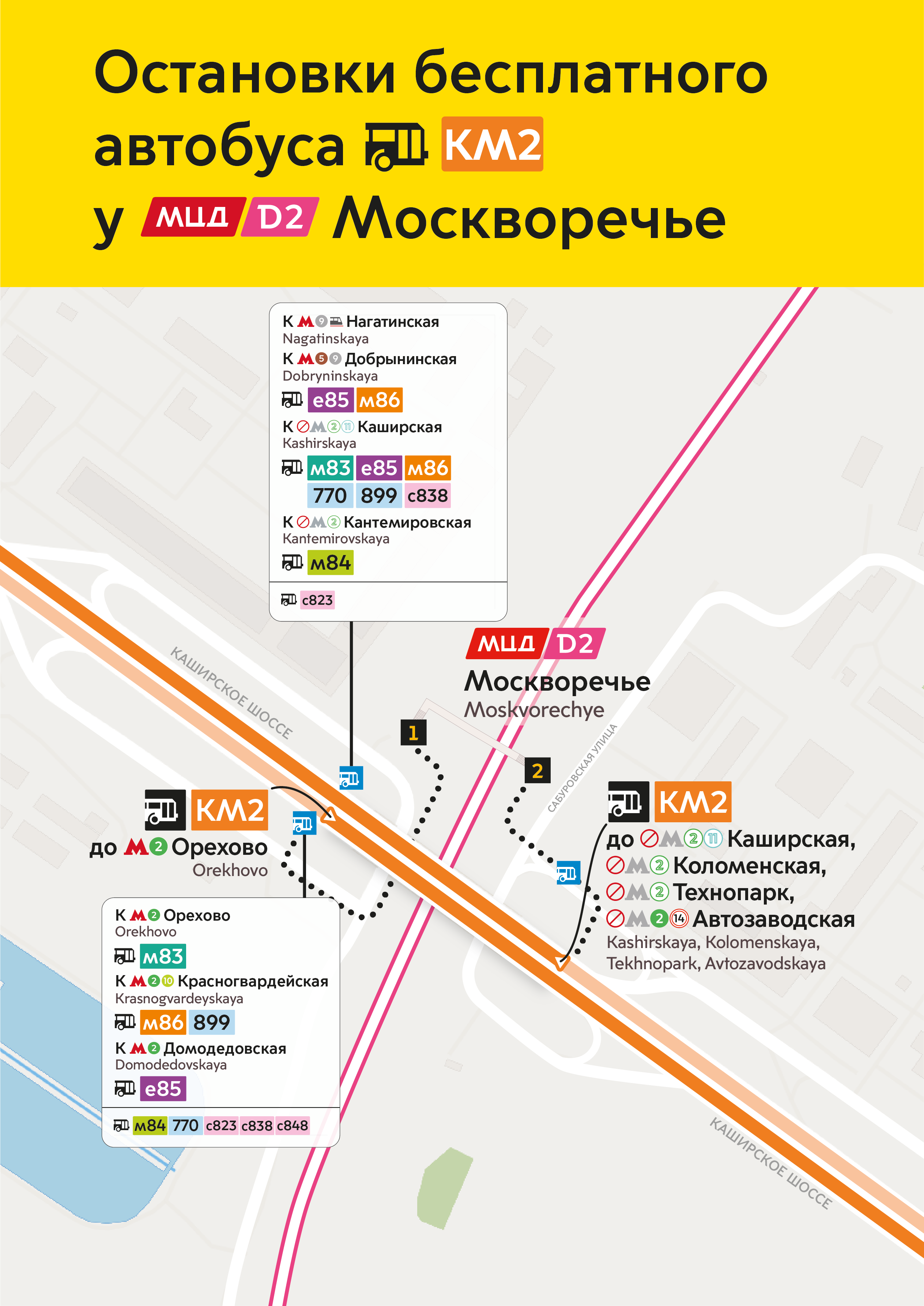 Показываем места остановок бесплатных автобусов КМ, на которых можно доехать вдоль закрытого участка Замоскворецкой линии «Автозаводская» — «Орехово».